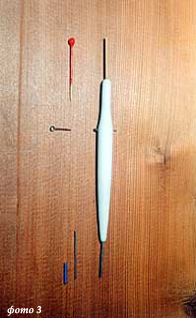 7. Теперь необходимо приготовить фурнитуру. Из стальной проволоки диаметром от 1 до 1,5 мм изготавливаем стержень крепления поплавка к леске, длиной порядка 40 мм. Кембрик можно подобрать после, в зависимости от толщины используемой лески. Антенну желательно изготовить из деревянной зубочистки или из толстой (1,5 мм) лески. А для лучшей видимости ее можно оснастить небольшим шариком, окрашенным в яркий цвет. Петлю для пропуска лески изготавливаем из медной проволочки (фото 3).